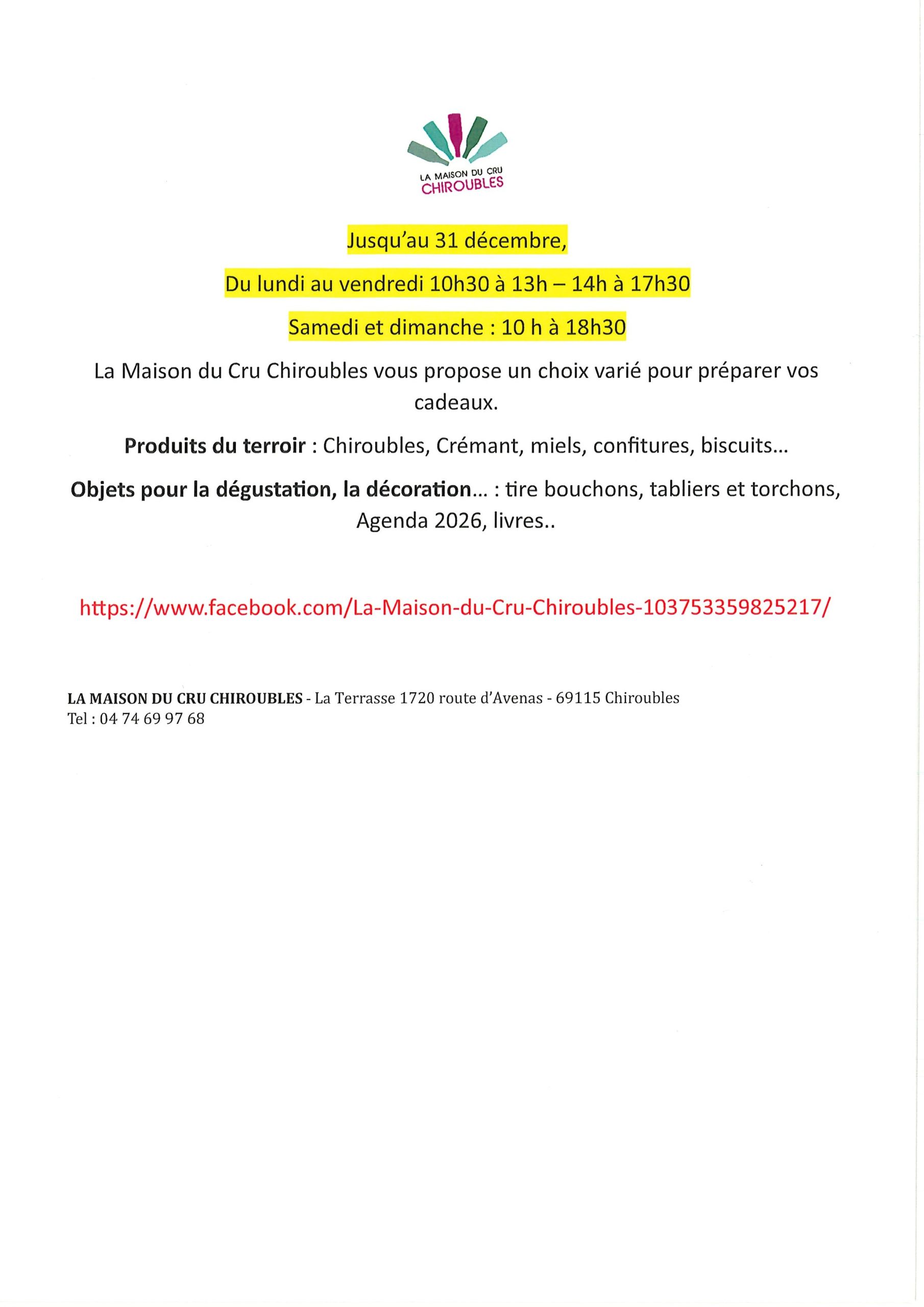 Maison du Cru Chiroubles : horaires d’ouverture et idées cadeaux terroir jusqu’au 31 décembre